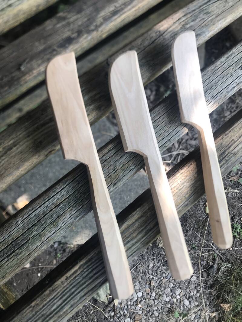 - Met de bijl de ruwe vorm van je botermes/spatel of lepel uithakken